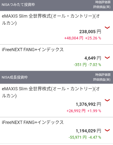 | 成長投資枠FANG+ | 1,194,029円 | 1,236,425円 | −42,396円 |